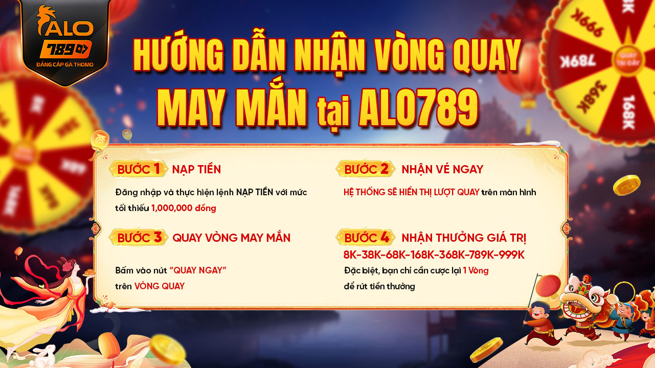 Cứ mỗi lệnh nạp từ 1,000,000 VND trở lên tại ALO789, Thành Viên sẽ nhận ngay vé quay miễn phí tham gia chương trình.